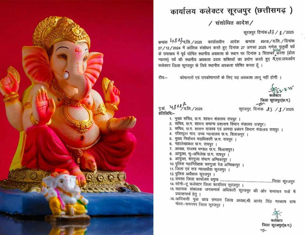 सूरजपुर छत्तीसगढ़ के सूरजपुर जिले में कलेक्टर ने गणेश चतुर्थी का अवकाश रद्द कर दिया है. कलेक्टर एस जयवर्धन ने…