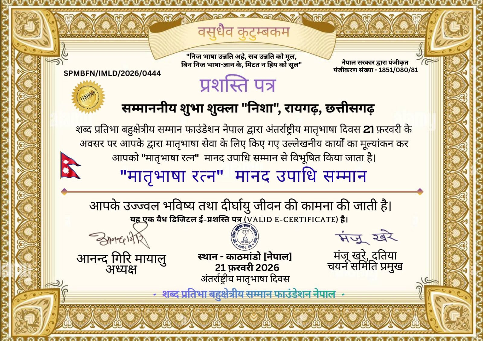 रायपुर की शुभा शुक्ला निशा नेपाल में “मातृभाषा रत्न मानद उपाधि “से सम्मानित हमारे देश में अंतर्राष्ट्रीय मातृभाषा दिवस बड़े…