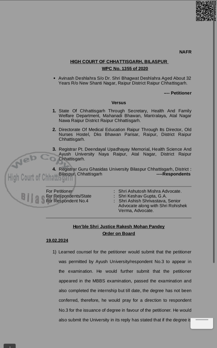 रायपुर जिले के शांति नगर निवासी अविनाश देशलहरा द्वारा वर्ष 2007-08 में एमबीबीएस प्रथम वर्ष पाठ्यक्रम में छत्तीसगढ़ इंस्टीट्यूट आफ मेडिकल साइंस बिलासपुर में एडमिशन लिया था, किंतु कुछ पारिवारिक कारणों से वर्ष 2015 में हुई एमबीबीएस फाइनल पार्ट वन की परीक्षा देने में असफल रहा, इसके बाद अभ्यर्थी अविनाश देशलहरा द्वारा एमबीबीएस फाइनल पार्ट 1 की परीक्षा में बैठने हेतु एक अनुरोध पत्र विभागीय मंत्री और छत्तीसगढ़ इंस्टिट्यूट ऑफ मेडिकल साइंस बिलासपुर के डीन के के समक्ष किया था, अविनाश देशलहरा की पारिवारिक स्थिति को देखते हुए रजिस्ट्रार आयुष यूनिवर्सिटी द्वारा अविनाश देशलहरा को एमबीबीएस फाइनल पार्ट वन की परीक्षा में बैठने हेतु अनुमति प्रदान कर दी गई, तथा गुरु घासीदास विश्वविद्यालय द्वारा एनओसी लेटर भी जारी कर दिया गया था, किंतु आयुष यूनिवर्सिटी द्वारा परीक्षा पास करने के उपरांत तथा इंटर्नशिप पूरी करने के बाद भी अविनाश देशलहरा को एमबीबीएस की डिग्री नहीं दिया जा रहा था, जिससे परिवेदित होकर अविनाश देशलहरा हाई कोर्ट अधिवक्ता श्रीमती अक्षरा अमित और आशुतोष मिश्रा के माध्यम से हाई कोर्ट में याचिका प्रस्तुत किया था जिसकी सुनवाई 19 फरवरी 2024 को न्यायमूर्ति राकेश मोहन पांडे जी के यहां हुई, जिसकी सुनवाई करते हुए माननीय न्यायालय ने उत्तर वादी आयुष यूनिवर्सिटी को निर्देशित किया की याचिकाकर्ता के आवेदन पर विचार करते हुए 4 सप्ताह के अंतर्गत एमबीबीएस की डिग्री देने हेतु निर्देश देते हुए प्रकरण का निराकरण किया गया