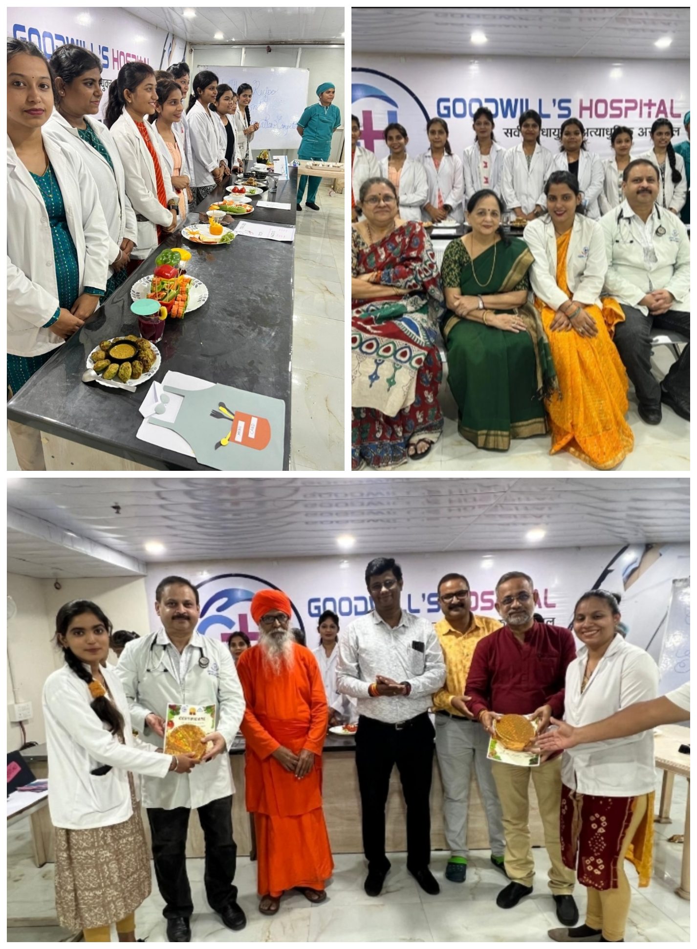 गुडविल हास्पिटल के चीफ़ डायटीशियन साक्षी सिंह ने बताया कि आहार चिकित्सा विभाग के द्वारा आहार चिकित्सा के व्यंजन और सलाद डेकोरेशन प्रतियोगिता का आयोजन किया गया। इस प्रतियोगिता में इंटर्न डायटीशियन और वर्किंग नर्सों ने भाग लिया . प्रतियोगिता में भाग लेने के लिये पौष्टिक और चिकित्सा में उपयोगी आहार रेसिपी को बना कर प्रदर्शित किया गया।