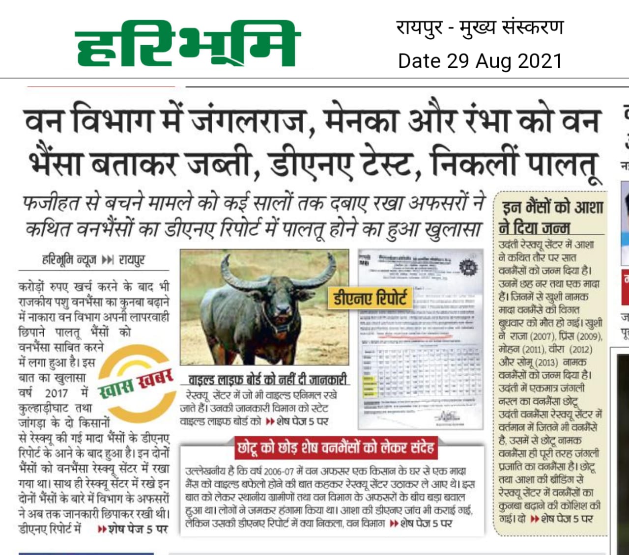 वन विभाग के अधिकारी इस प्रकार से कई सालो से शासन से ठगी करते आ रहे है | वन विभाग के इस कारनामे को हरिभूमि समाचार पत्र ने 29 अगस 2021 को समाचार प्रकाशित कर उजागर किया है और बताया है की उदंती सीतानदी टाईगर रिजर्व में वनभैंसा नहीं है वो पालतू भैंस है जिसे वन विभाग के अधिकारी ग्रामीणों से खरीदते है और वन भैंसा घोषित कर देते है | प्रकाशित समाचार में बताया गया है की वनभैंसा के डी एन ए रिपोर्ट में पालतू भैंसा होने का रिपोर्ट आया है | इससे साफ़ पता चल रहा है की वन विभाग के द्वारा गाँव के पालतू भैंसों को 30 – 30 हजार में खरीदा गया है और राजकीय पशु वनभैंसा घोषित कर दिया है जबकि वास्तविकता यह है की उदंती सीतानदी टाईगर रिजर्व में कोई भी वन भैंसा नहीं है जो है वह फर्जी वनभैंसा है |