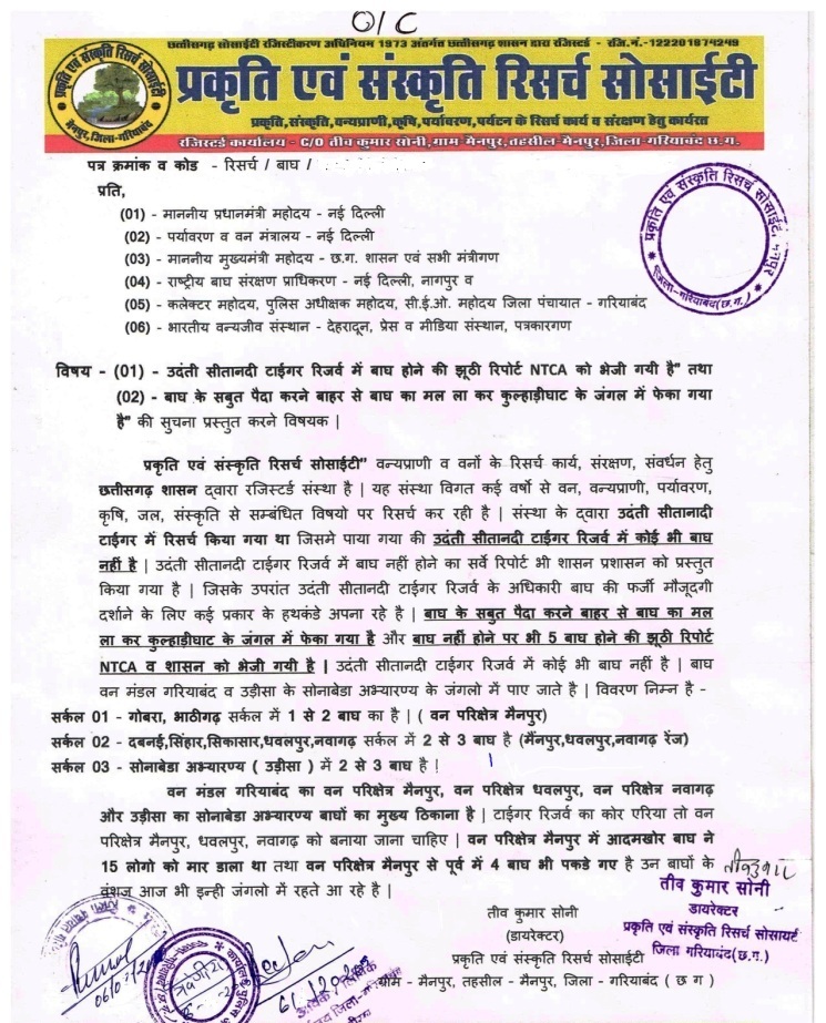 उदंती सीतानदी टाइगर रिजर्व में बाघ का फर्जी फोटो , फर्जी मल , फर्जी पंजा बनाया गया है भारत सरकार , वन मंत्रालय और राष्ट्रीय बाघ संरक्षण प्राधिकरण (एनटीसीए) को शिकायत कर बताया था – रिसर्चर तीव कुमार सोनी