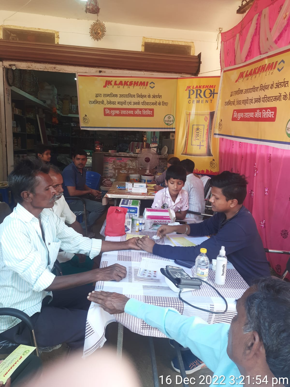 जेके लक्ष्मी सीमेंट कंपनी द्वारा 16 दिसंबर को शिवम सेल्स धौराकोट ध्रुवापारा में 16.12.2022 को निःशुल्क चिकित्सा शिविर आयोजित हुई जिसमें डॉक्टर जफर कुरेशी एवं उनकी टीम द्वारा 50 राजमिस्त्री, सिविल ठेकेदार सपरिवार रक्तचाप,रक्त समूह,नेत्र ज्योति चिकित्सा, शारीरिक माप जांच, टिटनेस इंजेक्शन,ओ पी डी सलाह जैसे महत्वपूर्ण जांच करवाएं एवं स्वास्थ्य लाभ प्राप्त किए, देवभोग क्षेत्र के ठेकेदार बंधु एवं राजमिस्त्री सपरिवार शिविर में बढ़ चढ़कर हिस्सा लिया