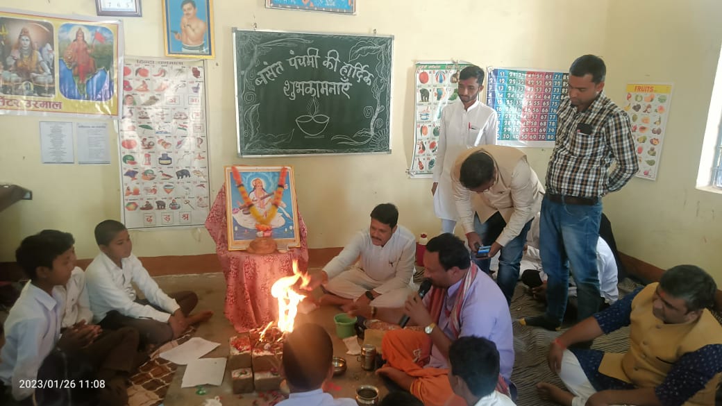 कार्यक्रम में मुख्य अतिथि के रूप में विद्यालय के अध्यक्ष श्री प्रेमावतार खरे उपाध्यक्ष, श्री राजकुमार अग्रवाल व्यवस्थापक, श्री जसवंत गोयल संस्थापक सदस्य, श्री मोहन गोयल सदस्य, श्री अनिल अग्रवाल, श्री राधे कुमार साहू एवं गांव के गणमान्य नागरिक तथा उपस्थित अभिभावकों के द्वारा सर्वप्रथम मां भारती के समक्ष दीप प्रज्वलन एवं पूजन अर्चन किया गया पूजन पश्चात माननीय अध्यक्ष श्री प्रेमावतार खरे के द्वारा झंडोत्तोलन का कार्यक्रम किया गया। झंडोत्तोलन पश्चात भैया बहनों का गीत भाषण का कार्यक्रम संपन्न हुआ। मुख्य अतिथि के द्वारा उद्बोधन में संविधान की आवश्यकता क्यों और इसकी क्या विशेषताएं हैं, देश के नागरिक का संविधान के प्रति क्या कर्तव्य है, इस विषय पर अपने विचार व्यक्त किये। गीत, भाषण के कार्यक्रम के पश्चात् विद्यालय में बसन्त पंचमी के शुभ अवसर पर मां सरस्वती का पूजन अर्चन एवं यज्ञ हवन किया गया, जिसमें गांव के गणमान्य नागरिक उपस्थित थे। इस कार्यक्रम में नन्हे-मुन्ने भैया बहनों का विद्यारंभ संस्कार, पट्टी पूजन भी किया गया। सरस्वती माता की आरती के पश्चात प्रसाद एवं मिष्ठान वितरण कर कार्यक्रम के समापन की घोषणा की गई। विद्यालय के प्रधानाचार्य श्री रमाकांत बेहरा ने समस्त अतिथियों का आभार व्यक्त किया। कार्यक्रम का संचालन आचार्य श्री टेकराम जी ने किया। इस कार्यक्रम को सफल बनाने में समिति के सभी सदस्य आचार्य परिवार एवं भैया बहनों का सराहनीय सहयोग रहा।