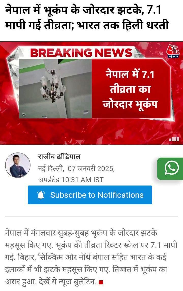 जनवरी में हिमालय क्षेत्र के देशो नेपाल,चीन में 7 तीव्रता के भूकंप आने का रिसर्चर तीव कुमार सोनी का रिसर्च सही सिद्ध हुआ है | जनवरी में हिमालय क्षेत्र के देशो नेपाल,चीन (तिब्बत), भूटान में 7 तीव्रता का भूकंप आया है |