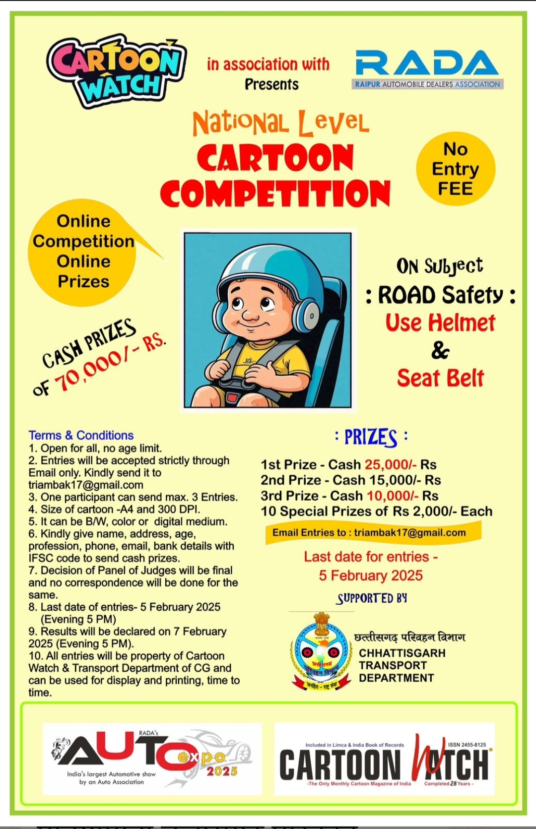 रायपुर. यातायात सप्ताह के अवसर पर देश की एकमात्र कार्टून वॉच पत्रिका द्वारा अखिल भारतीय सकारात्मक कार्टून प्रतियोगिता की शुरुआत की जा रही है. यह प्रतियोगिता छत्तीसगढ़ परिवहन विभाग और रायपुर ऑटोमोबाइल डीलर एसोसिएशन (राडा ) के संयुक्त तत्वावधान में किया जा रहा है . पत्रिका के संपादक त्र्यम्बक शर्मा ने जारी विज्ञप्ति में बताया कि “ रोड सेफ्टी: हेलमेट पहनें और सीट बेल्ट लगायें”विषय पर देश भर के कार्टूनिस्टों से निवेदन किया गया है कि वे अपनी कला के माध्यम से अपनी भावना व्यक्त करें. इस प्रतियोगिता में कोई भी उम्र का व्यक्ति अपनी प्रविष्टि भेज सकता है. यह निःशुल्क है. श्री शर्मा ने आगे बताया कि 5 फ़रवरी 2025 की शाम 5 बजे तक ही प्रविष्टियाँ स्वीकार की जायेंगी और उन्हें इस ईमेल आईडी पर भेज भेजना होगा. triambak17@gmail.com
