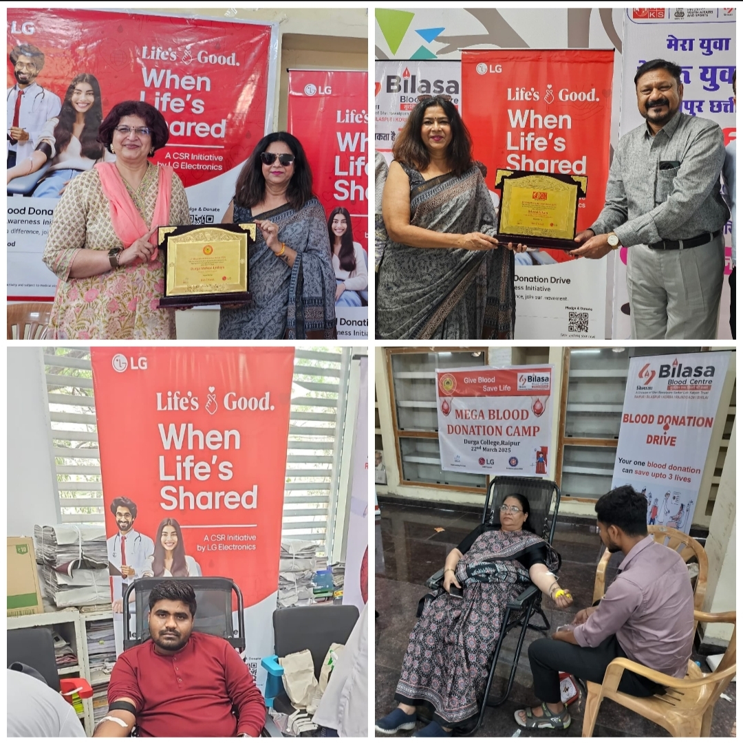 रायपुर – एल.जी “लाइफ गुड” के द्वारा मेगा ब्लड डोनेशन ड्राइव का आयोजन संकल्प सांस्कृतिक समिति तथा बिलासा ब्लड सेंटर रायपुर, छत्तीसगढ़ के सहयोग से दुर्गा कॉलेज एवं नालंदा परिसर रायपुर में आयोजित किया गया, इस कार्यक्रम में 160 से ज्यादा लोगो ने रक्तदान किये एवं सभी ने रक्तदान के बारे में सकारात्मक प्रतिक्रिया देते हुए एल.जी “लाइफ गुड” के द्वारा चलये जा रहे इस पहल की सराहना की एवं सभी सेवा दे रहे सेवकों के कार्यो को सराहा, संकल्प सांस्कृतिक समिति की निर्देशक मनीषा शर्मा ने एल.जी की ओर से दुर्गा कॉलेज के प्राचार्या डॉ. प्रोतिभा मुखर्जी साहूकार एवं श्री अतुल निकम, राज्य निदेशक, नेहरु युवा केंद्र संगठन को इस पहल में महत्वपूर्ण सहयोग के लिए मोमेंटो भेट कर सम्मानित किया गया l इस कार्यक्रम में दुर्गा कॉलेज के राष्ट्रीय सेवा योजना (NSS) के स्वयंसेवकों के द्वारा बढ़ चढ़कर हिस्सा लिया गया जिसमें उन्होंने स्व रक्तदान किया वही रक्तदाताओ की सहायत किया जिसके लिए विशेष रूप से सुनीता चंसोरिया, प्रोफेसर एवं एन.एस.एस. हेड दुर्गा कॉलेज का विशेष रूप से धन्यवाद दिया, इस कार्यक्रम में संकल्प सांस्कृतिक समिति विभिन्न परियोजनाओ के टीम ने महत्त्वपूर्ण योगदान दिया जिसमें SLCA से नीरज साहू, मनीषा कुर्रे, रितेश साहू, IRCA से शैलेश भगत, अरुण मिंज, ODIC से वर्षा ठाकुर, विनीता पाण्डेय, विवेक वैष्णव, सुषमा सेन, CPLI से राजकमल रात्रे एवं जिज्ञासा पाल के द्वारा योगदान सराहनीय रहा l