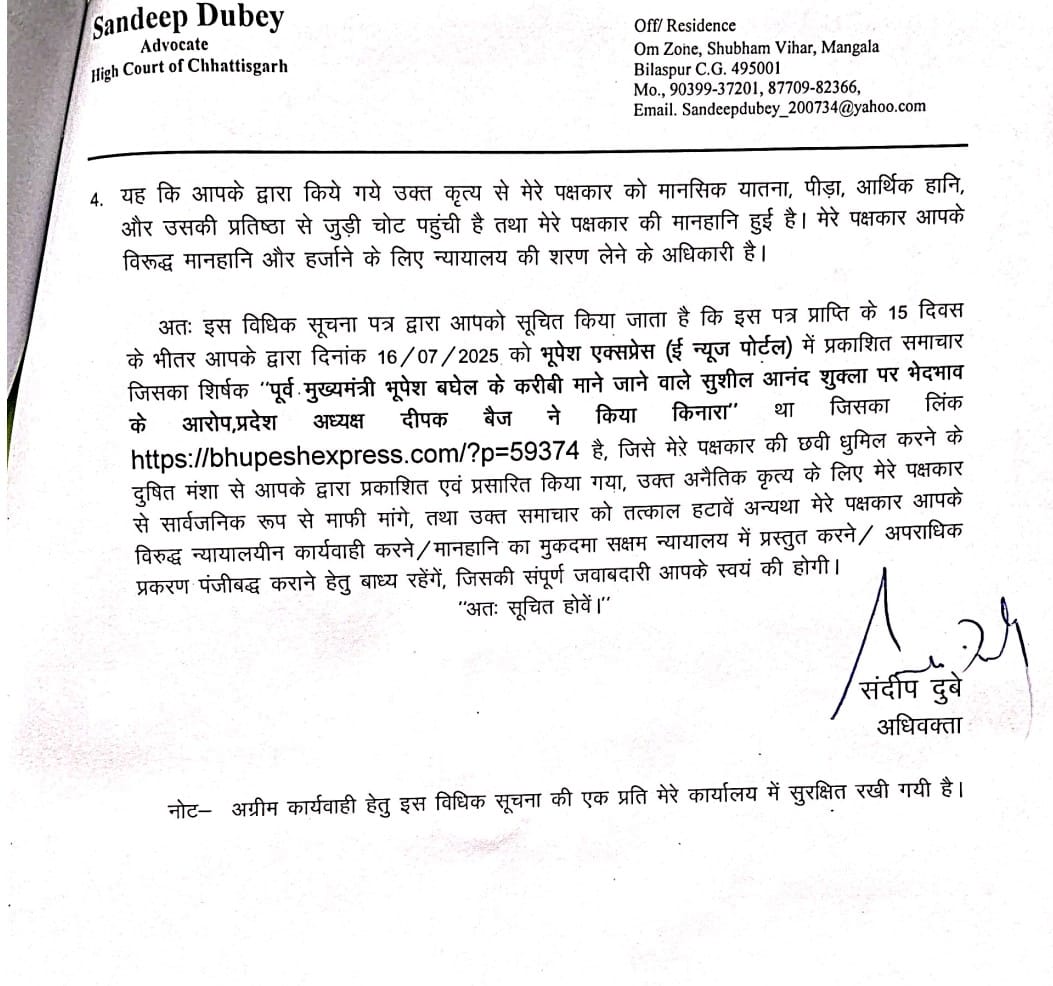 एक बड़ा सवाल यह भी उठ रहा है कि पत्रकार विप्लव दत्ता को भेजा गया कानूनी नोटिस क्या कांग्रेस नेतृत्व की सहमति से भेजा गया या यह संचार प्रमुख की व्यक्तिगत पहल थी? रिपोर्ट के अनुसार, जिस खबर को लेकर नोटिस भेजा गया, उसमें यह कहा गया था कि सुशील आनंद शुक्ला केवल पूर्व मुख्यमंत्री भूपेश बघेल के करीबी हैं और अन्य नेताओं की अनदेखी करते हैं। खबर में प्रदेश अध्यक्ष दीपक बैज, नेता प्रतिपक्ष डॉ. चरण दास महंत, पूर्व मंत्री जयसिंह अग्रवाल और टीएस सिंहदेव की नाराजगी का भी उल्लेख किया गया था।