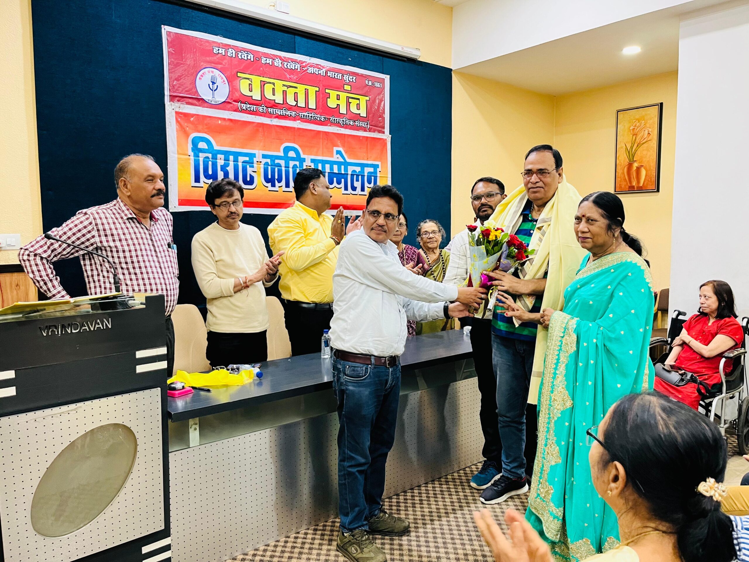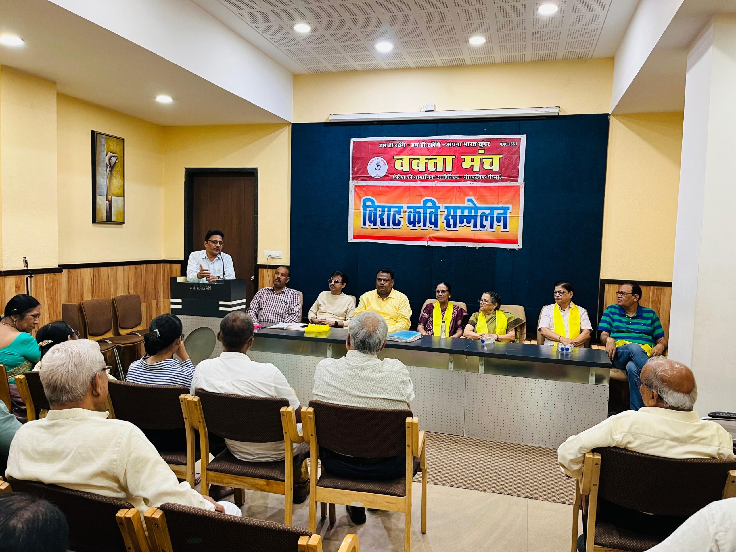रायपुर l सामाजिक व साहित्यिक संस्था ” वक्ता मंच” की मासिक काव्य गोष्ठी 27 जुलाई की संध्या वृन्दावन सभागृह में संपन्न हुई l इसमें प्रदेश भर से आये 60 से अधिक कवियों ने ” वर्षा ऋतु” विषय पर प्रस्तुति दी l कार्यक्रम के मुख्य अतिथि वरिष्ठ पत्रकार प्रदीप जोशी थे l अध्यक्षता चंद्रकला त्रिपाठी ने की l यतीश श्रीवास्तव, टी के भोई, लतिका भावे, डॉ महेंद्र ठाकुर एवं राजकुमार धर द्विवेदी विशेष अतिथि की आसंदी पर उपस्थित थे l इस अवसर पर 2 बाल कवयित्रियों दुर्ग की आद्या प्रियदर्शिनी बिनोये एवं रायपुर की दिव्यांका पुरोहित की विशेष प्रस्तुति रखी गई थी एवं उनका सम्मान किया गया l