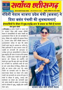 भाजपा प्रदेश मंत्री नंदिनी नेताम ने क्षेत्रवासियों दिया बसंत पंचमी की शुभकामनाएं | क्षेत्रवासियों के जीवन में सुख-समृद्धि और ज्ञान के प्रकाश का किये है कामना